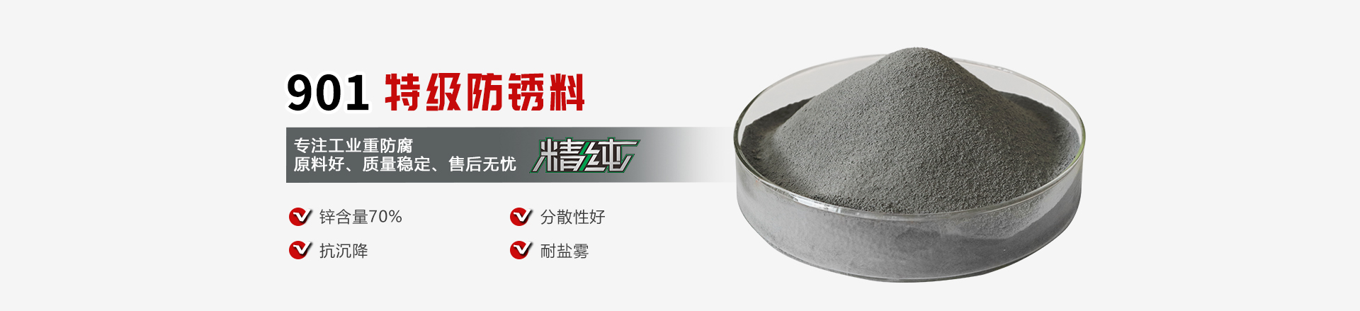 901特級防銹料是鋅粉和有機高分子的聚合物,金屬鋅含量70%。相較于普通鋅粉,901特級防銹料在涂層表層消耗降低,腐蝕產物減少,且涂層的陰極保護作用時間延長20%。產品具有抗沉降,分散性好,耐鹽霧能力強等顯著特性。