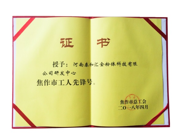 2018年4月,河南泰和匯金粉體科技有限公司研發中心榮獲“焦作市工人先鋒號”榮譽證書,這是焦作市總工會對泰和匯金研發中心工作的認可,也是對泰和匯金研發中心創新精神的肯定。……